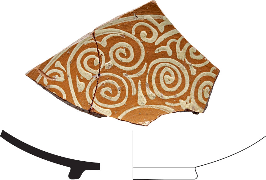Interior painted with white engobe, light yellow glaze. Exterior covered with white slip. Red clay with tiny limestone particles. Light on Dark Slip Painted II, middle – end of the 12th c.