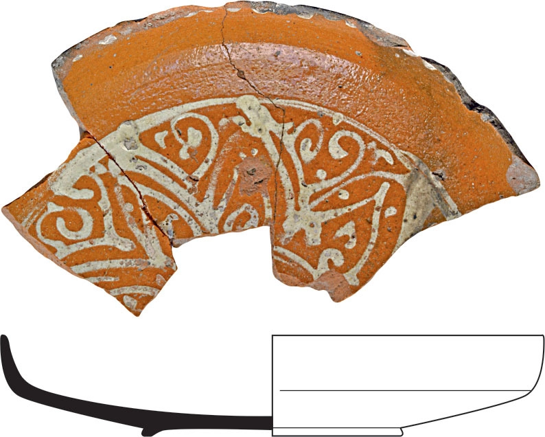 Interior painted with white engobe, light yellow glaze. Exterior covered with white slip. Red clay with tiny limestone particles. Light on Dark Slip Painted II, middle – end of the 12th c.