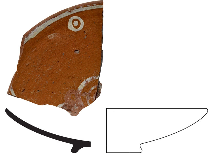 Interior painted with white engobe, light yellow glaze. Exterior covered with white slip. Red clay with tiny limestone particles. Light on Dark Slip Painted II, middle – end of the 12th c.